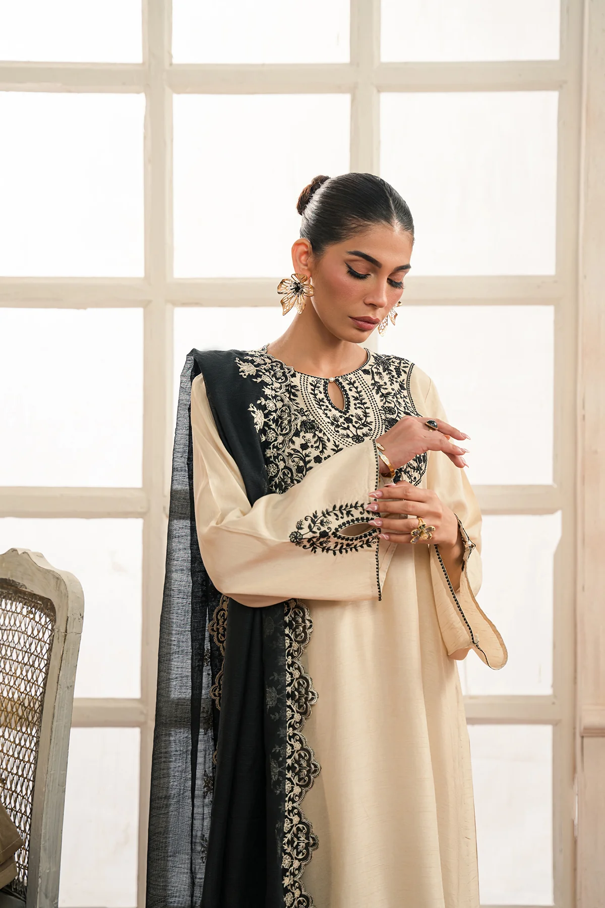BLAIR is a stunning 3-piece ivory raw silk ensemble with intricate black thread work on the neckline, sleeves, and borders. Complemented with a contrasting black cotton net dupatta and embroidered raw silk culottes. Featuring slit flare sleeves, a teardrop neckline on the back and pearl detailing.