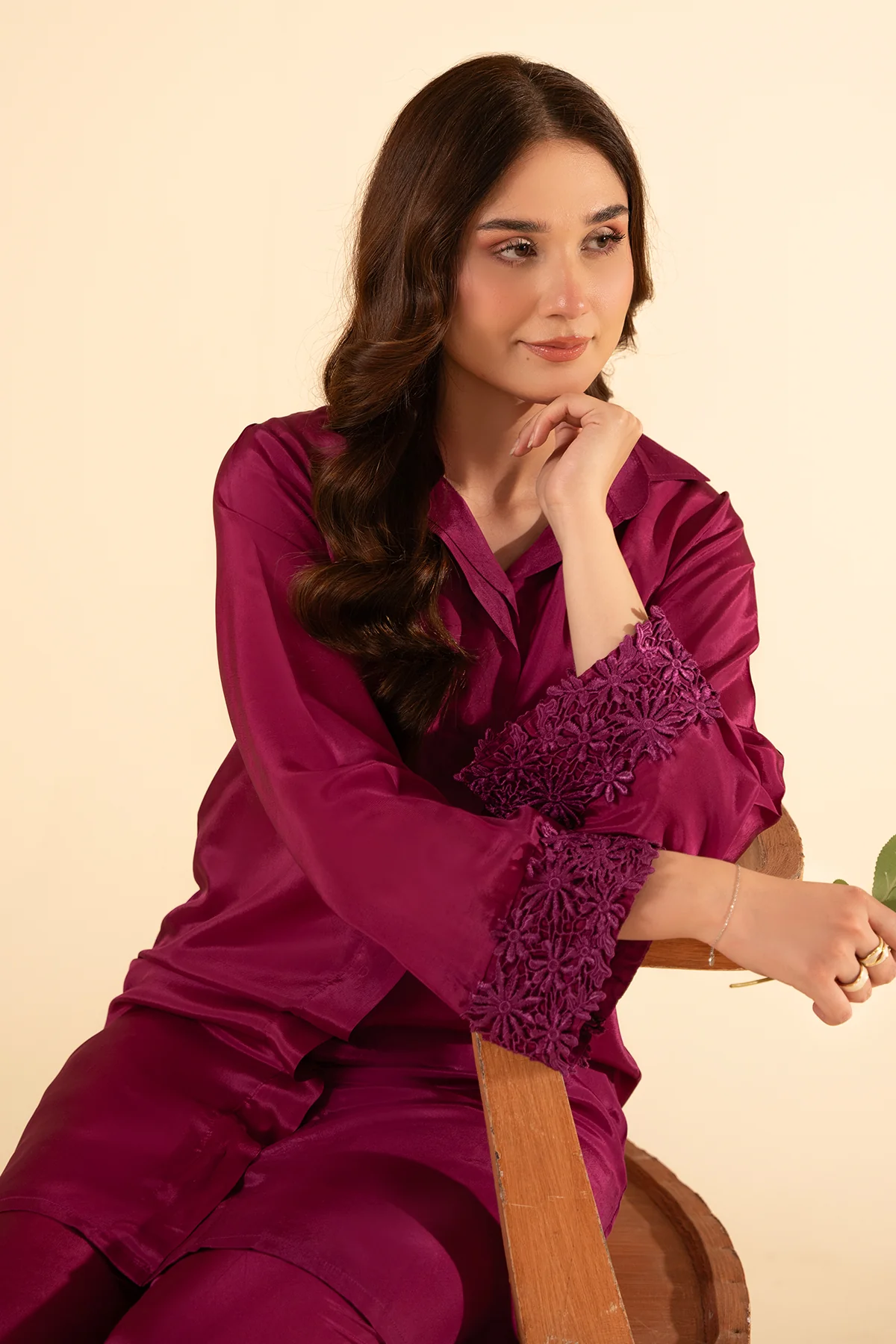 2 PC (Shirt and Trouser) solid co-ord set with 3D embroidered lace detailing.
