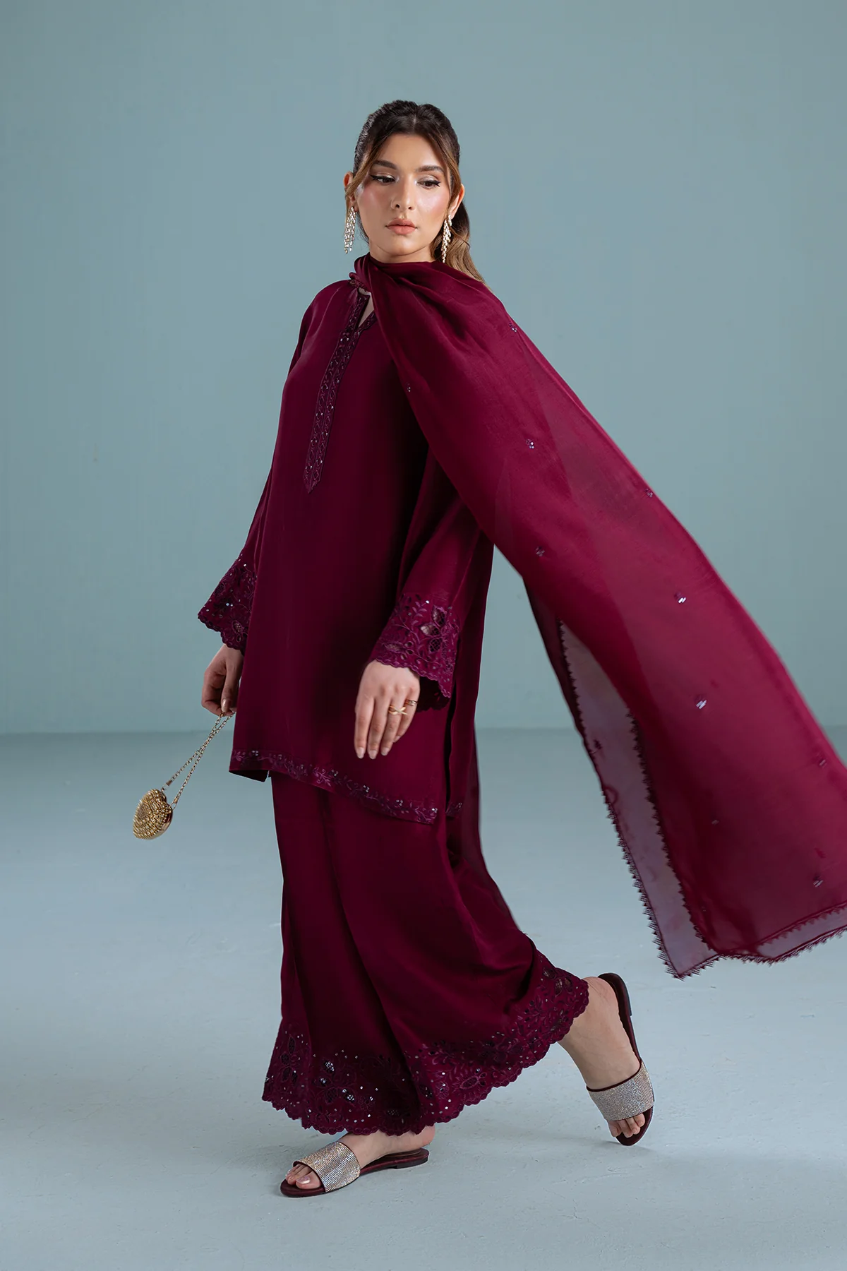 Hana is a 3-piece burgundy sheesha silk ensemble with subtle colour-on-colour floral embroidery, intricate boring and jaali work, and delicate sequins on the short shirt. Featuring loose azaar pants with matching embroidered details. Paired with a medium silk dupatta adorned with motifs and a gentle sequin spray.