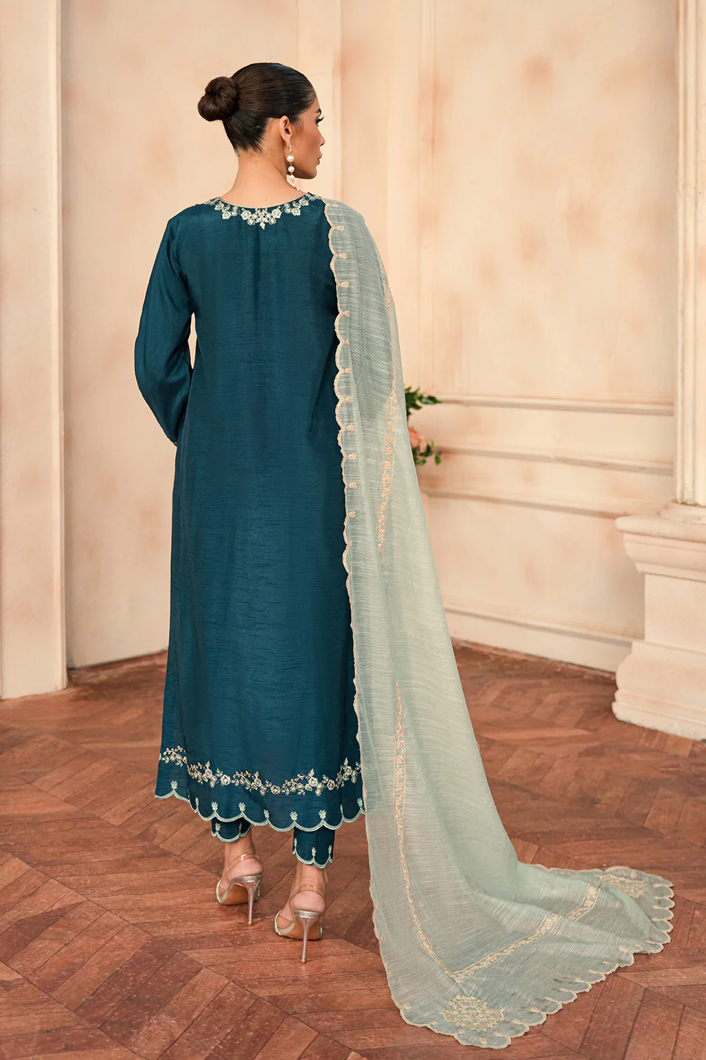 NADINE is a stunning 3-piece ensemble, meticulously crafted on a teal raw silk with intricate ivory, light blue, and prussian embroidery. It features scalloped sleeves and hem and pearl detailing on the neckline. The light blue cotton net dupatta gives it a soothing contrast. Paired with raw silk pants to complete the look!