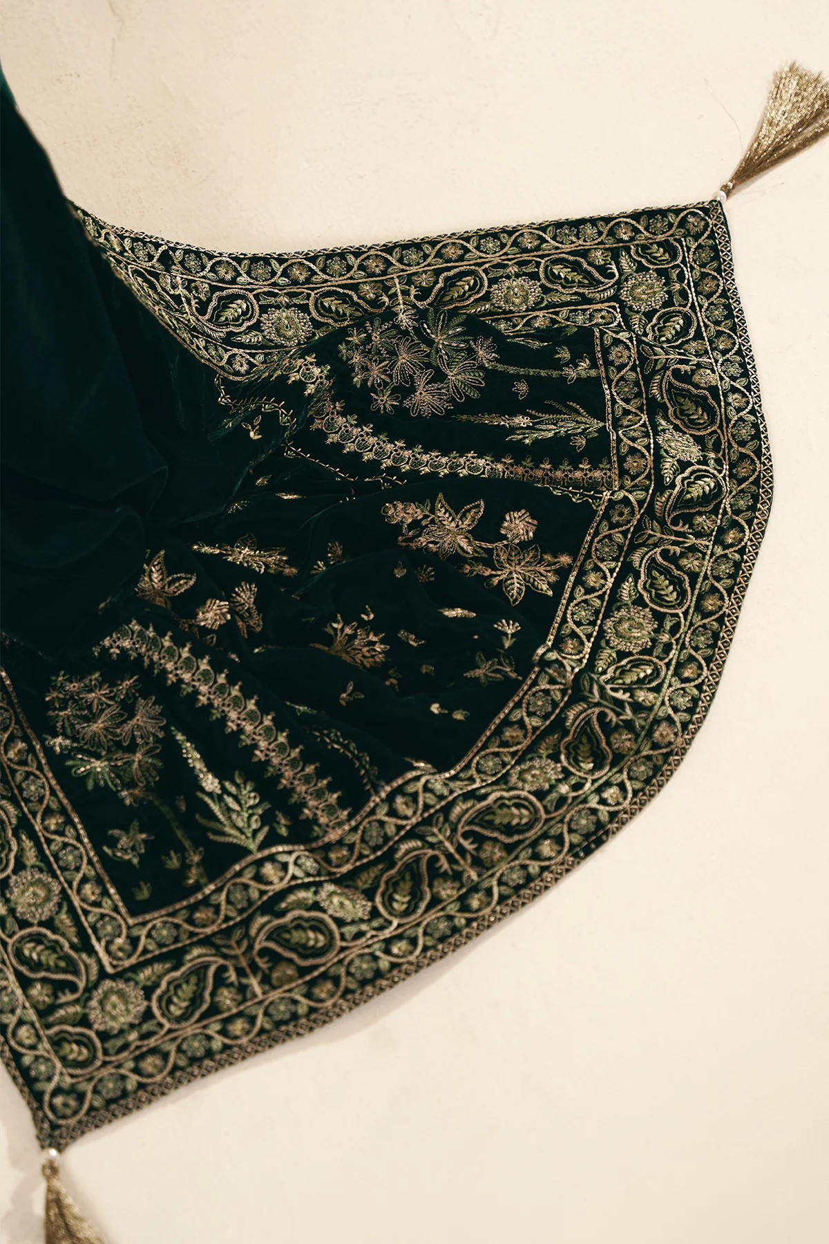 This luxurious velvet shawl features heavily embroidered borders and pallu with intricate floral threadwork in varying shades of green and gold. The shawl is embellished with tassels to complete the look. This premium velvet shawl drapes beautifully, making it a royal statement piece for formal occasions. Pair it with a plain solid (sold separately) or dress it up by pairing it with a formal outfit!